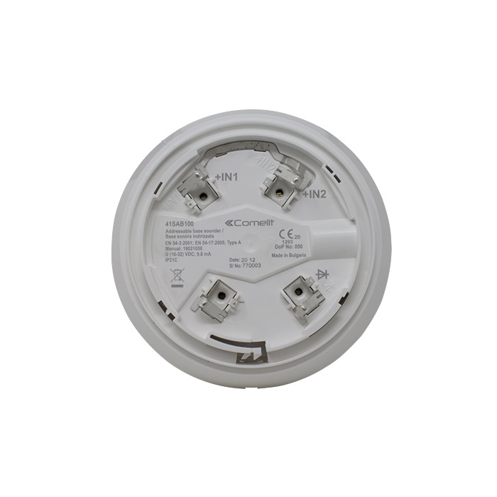 24La base sonora indirizzata 41SAB100 serie LOGIFIRE, ? una base con sirena integrata. Su di essa ? possibile montare direttamente un rivelatore, minimizzando lo spazio necessario all'installazione. Viene alimentata direttamente dalla centrale ed ? controllata attraverso il protocollo di comunicazione, integra 32 differenti toni e 2 livelli sonori programmabili da centrale. Base sonora dal design rivisitato adatta a qualsiasi tipo d'installazione anche quelle pi? esigenti dal punto di vista estetico. Family feeling con tutti i sensori della nuova serie LOGIFIRE Comelit. Montaggio su base 41RBX020. Isolatore integrato. Certificazione secondo EN54-3 e EN54-17.