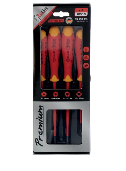 Set di 4 cacciaviti i-slim Torx® isolati 1000 V Premium. Composto da: 1 cacciavite i-SLIM Torx® T10 x 100, 1 cacciavite i-SLIM Torx® T15 x 125, 1 cacciavite i-SLIM Torx® T20 x 125, 1 cacciavite i-SLIM Torx® T25 x 125.