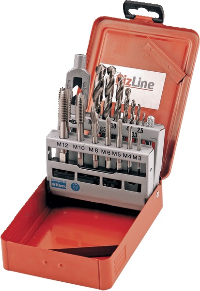 Set di maschi per acciaio, ghisa, leghe leggere, composta da 7 maschi, 7 punte e 1 chiave inglese. Punte HSS tagliate, fresate, autocentranti con bordi precisi per realizzare fori pilota.