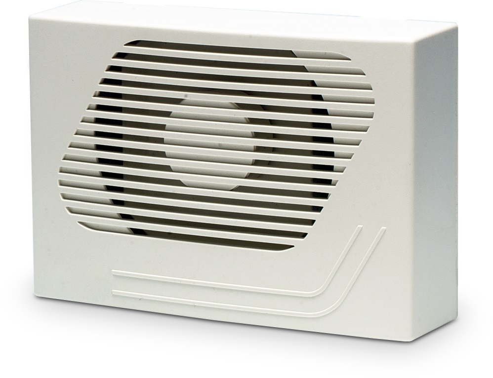 Sirena piezo autoalimentata, 102 dB, contenitore ABS bianco, alimentazione 12 V, batteria 9 V.
