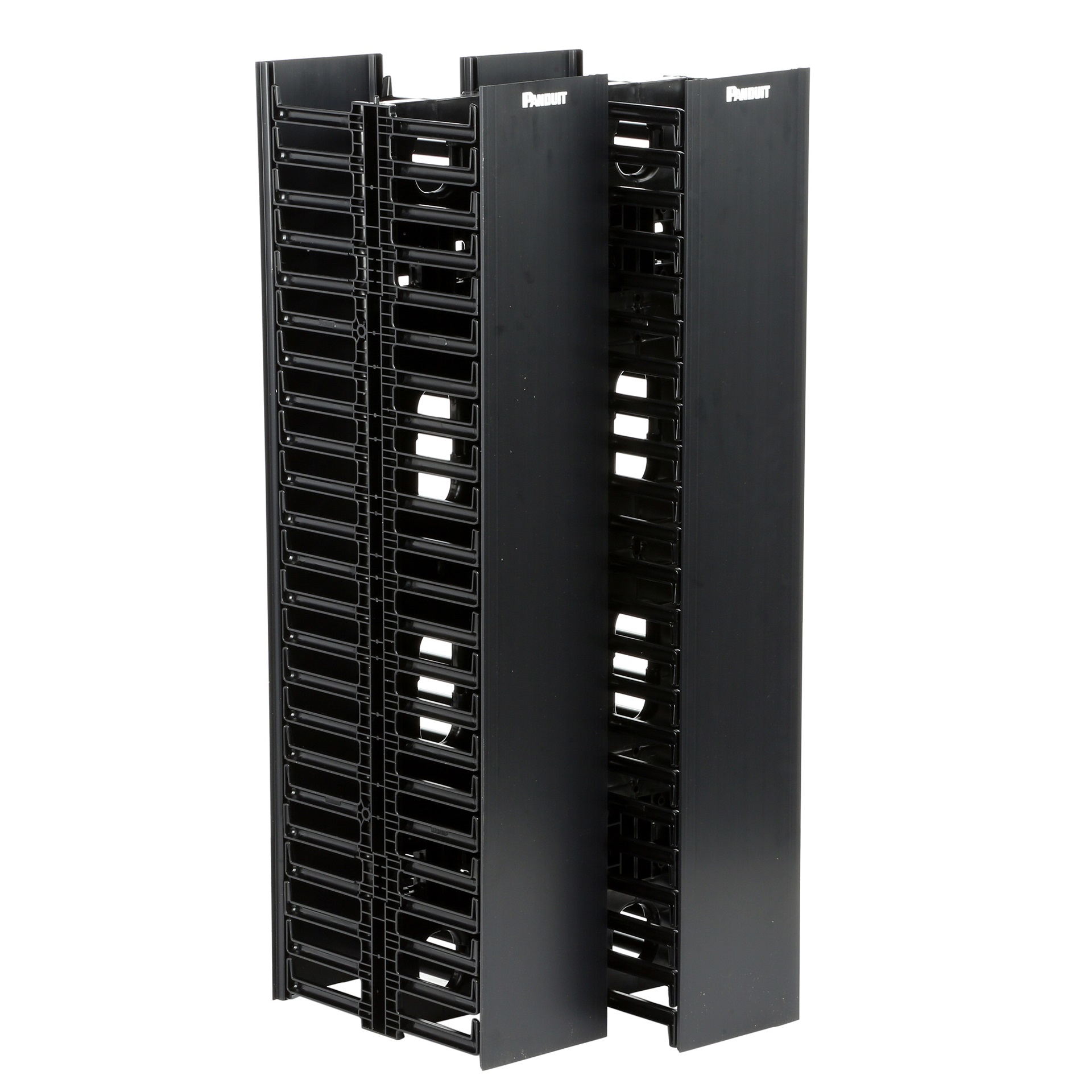 The NetRunner™ Vertical Cable Manager is a dual-sided cable manager that provides a cost-effective solution to organize, manage, and protect network cabling in telecommunication rooms and data centers. Cable management fingers simplify cable routing during installation and maintenance. The bend radius control helps protect cables from kinks and snags, ensuring system performance and reliability. The manager is 45 RU, 6.7 inches wide x 14.1 inches deep, includes dual-hinging covers and is black.