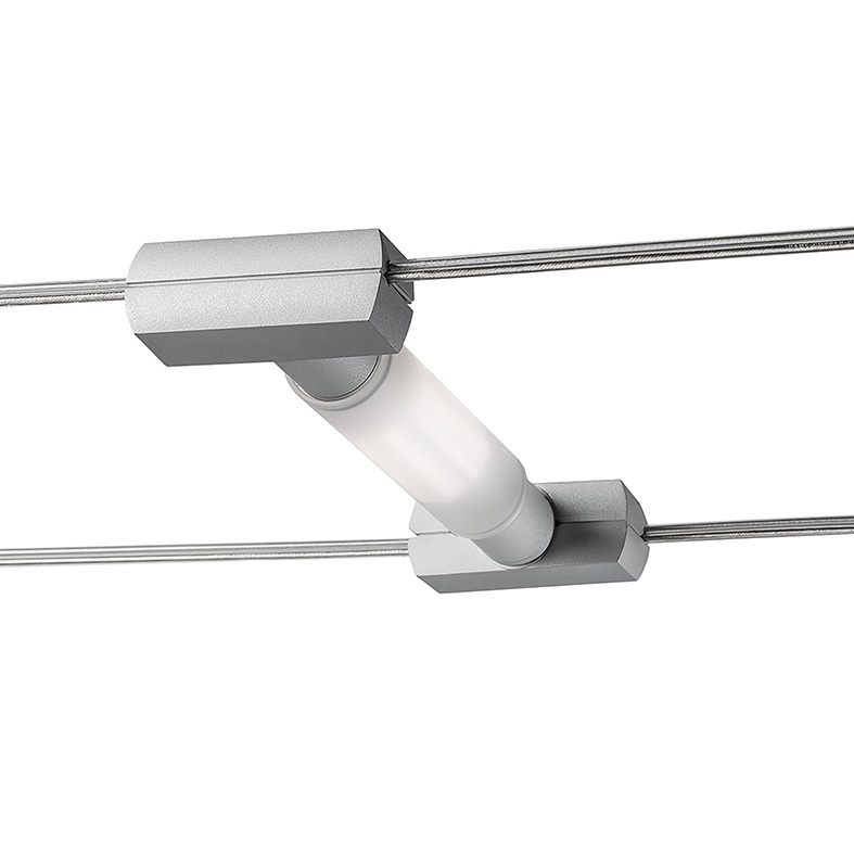 Sistema a tesata con coppia di cavi con interasse320mm: permette di installare apparecchi con fonte luminosa con LED integrato o con attacco tradizionale (GU10, R7s, E27 che consentono di montare lampadina LED). Corpi illuminanti in estruso di alluminio (verniciato bianco opaco o grigio opaco) e di ffusore in policarbonato. Disponibili in versioneluce diffusa, monoemissione o biemissione o a spot con corpo illuminante orientabile su due assi di ?35? rispetto all'asse verticale e di ?90? rispetto all'asse orizzontale. LED disponibile in due gr adazioni (3000K e 4000K).
