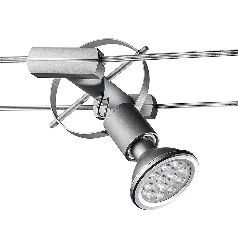 Sistema a tesata con coppia di cavi con interasse320mm: permette di installare apparecchi con fonte luminosa con LED integrato o con attacco tradizionale (GU10, R7s, E27 che consentono di montare lampadina LED). Corpi illuminanti in estruso di alluminio (verniciato bianco opaco o grigio opaco) e di ffusore in policarbonato. Disponibili in versioneluce diffusa, monoemissione o biemissione o a spot con corpo illuminante orientabile su due assi di ?35? rispetto all'asse verticale e di ?90? rispetto all'asse orizzontale. LED disponibile in due gr adazioni (3000K e 4000K).