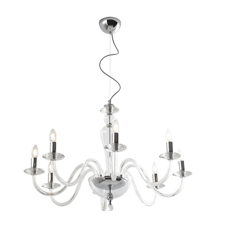 Lampada da parete, a sospensione chandelier e da tavolo con struttura in vetro lavorato a mano in stile classico, dettagli moderni in cristallo ottico e in metallo. La versione da parete ? disponibile con due bracci, mentre la versione a sospensionecon sei o otto. Disponibili in tre finiture (cristallo, ottanio e rubino). La versione da tavolo ? proposta in due finiture (bianco lucido e cristallo trasparente) con paralume in tessuto plissettatodi colore bianco. Attacco E14 che consente di mont are lamadina a LED.