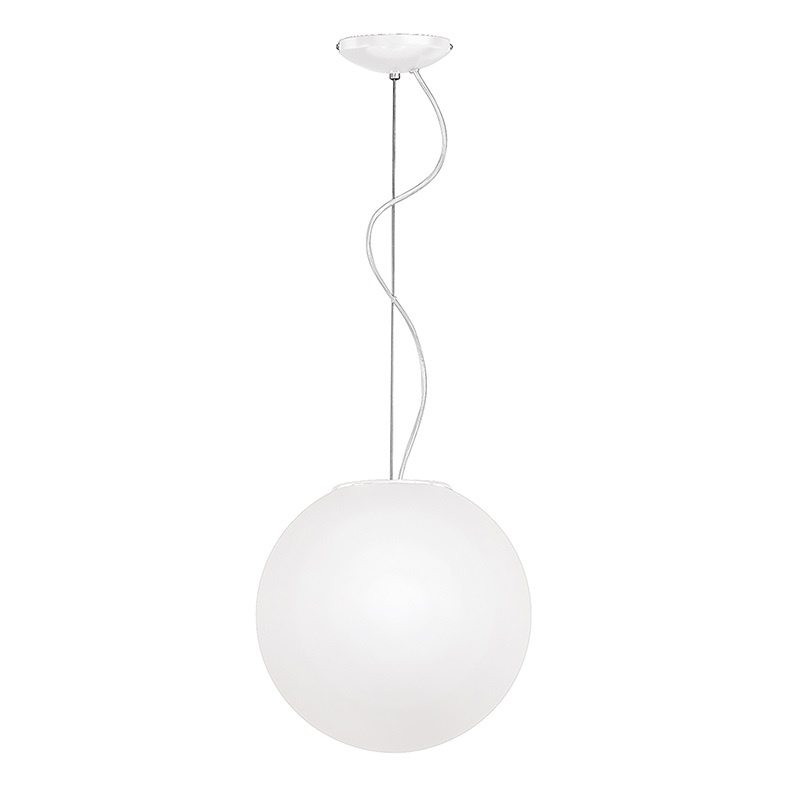 Lampada da soffitto o da parete, a sospensione, da tavolo e da terra con diffusore tondo in vetro so ffiato satinato, per un?ottima propagazione dellaluce. Disponibile in diversi diametri. Nella soluzione sospesa viene proposta in versione singola con rosone bianco, o in caduta multipla a tre elementi con kit di decentramento in finitura cromo. Per la versione da soffitto, a sospensione e tavolodisponibile con LED integrato (2700K) o con attacco E14 e E27 che consentono di montare lampadina LED. La piantana con treppiede in finitura bianca op aco ? proposta nella versione E27.