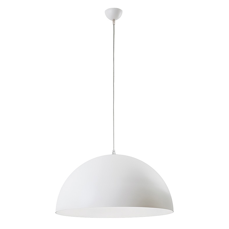 Lampada a sospensione semisfera in metallo verniciato disponibile nei colori bianco (con interno bianco) e nero (con interno bianco o oro). Particolari e rosone in tinta con il diffusore, cavo della sospensione in PVC trasparente. Attacco E27 che con sente di montare lampadina a LED.