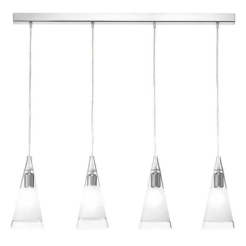 Lampada a sospensione a forma conica con diffusore in vetro soffiato cristallo con fascia satinata a copertura della fonte luminosa. Struttura e portalampada in metallo cromato. Disponibile nella versione singola, in cadute multiple con kit decentramento a tre e cinque elementi, con rosone lineare a tre e quattro elementi. Attacco E27 che consente di montare lampadina LED.