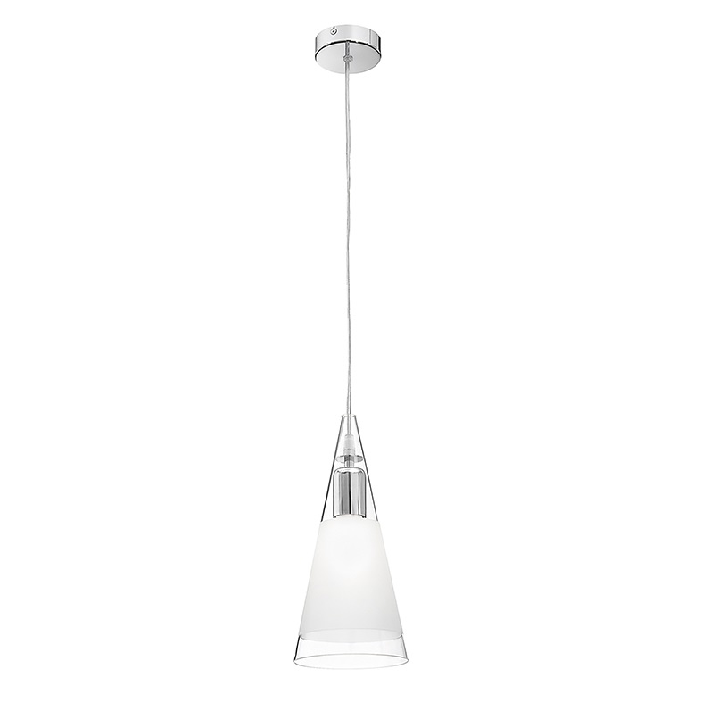 Lampada a sospensione a forma conica con diffusore in vetro soffiato cristallo con fascia satinata a copertura della fonte luminosa. Struttura e portalampada in metallo cromato. Disponibile nella versione singola, in cadute multiple con kit decentramento a tre e cinque elementi, con rosone lineare a tre e quattro elementi. Attacco E27 che consente di montare lampadina LED.