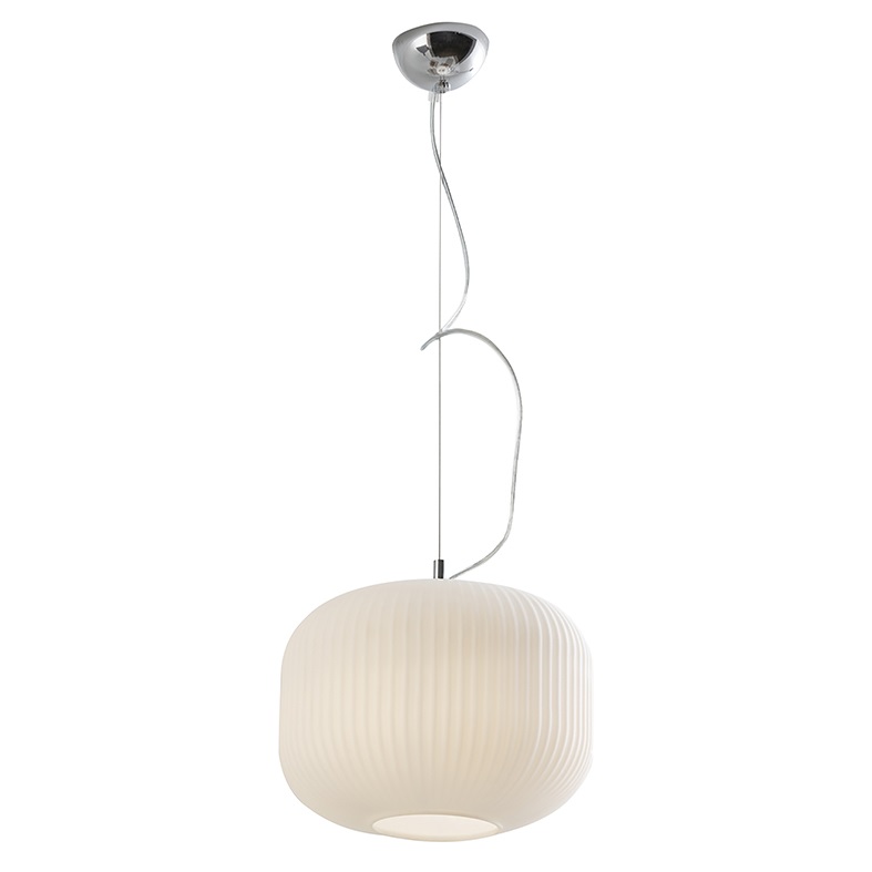Lampada da soffitto, a sospensione e da tavolo dal design semplice: struttura cromata e diffusore in vetro bianco satinato con pliss? geometrico ripro dotto sulla superficie che offre una luce diffusae confortevole. Attacco E27 che consente di montar e lampadina a LED.