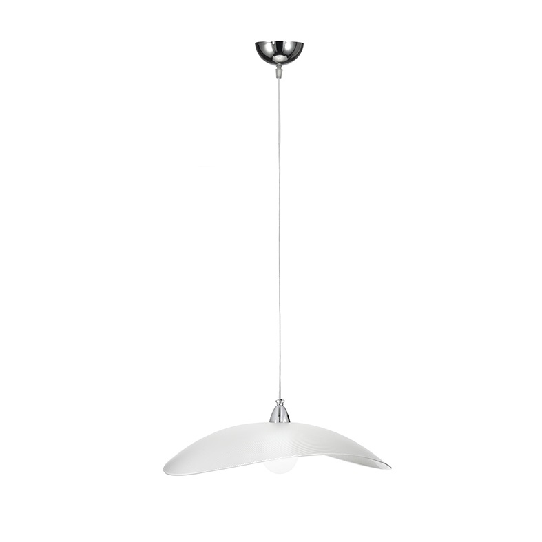 Lampada a sospensione, da parete e a soffitto in vetro satinato serigrafato. Struttura e particolari in metallo cromato. Proposta in diverse misure erelative potenze. Attacco E27 che consente di mont are lampadina a LED.
