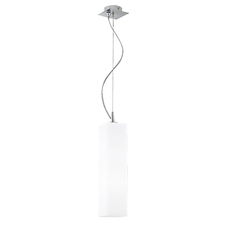 Lampada a sospensione, da tavolo e da terra dallaforma minimal e squadrata. Struttura e particolari in metallo cromato e diffusore bianco satinato. La versione da terra ? dimmerabile con varialuce. Attacco E27 che consente di montare lampadina a LED .