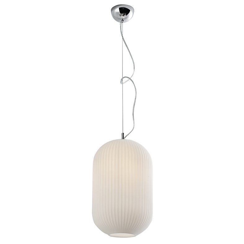 Lampada da soffitto, a sospensione e da tavolo dal design semplice: struttura cromata e diffusore in vetro bianco satinato con pliss? geometrico ripro dotto sulla superficie che offre una luce diffusae confortevole. Attacco E27 che consente di montar e lampadina a LED.