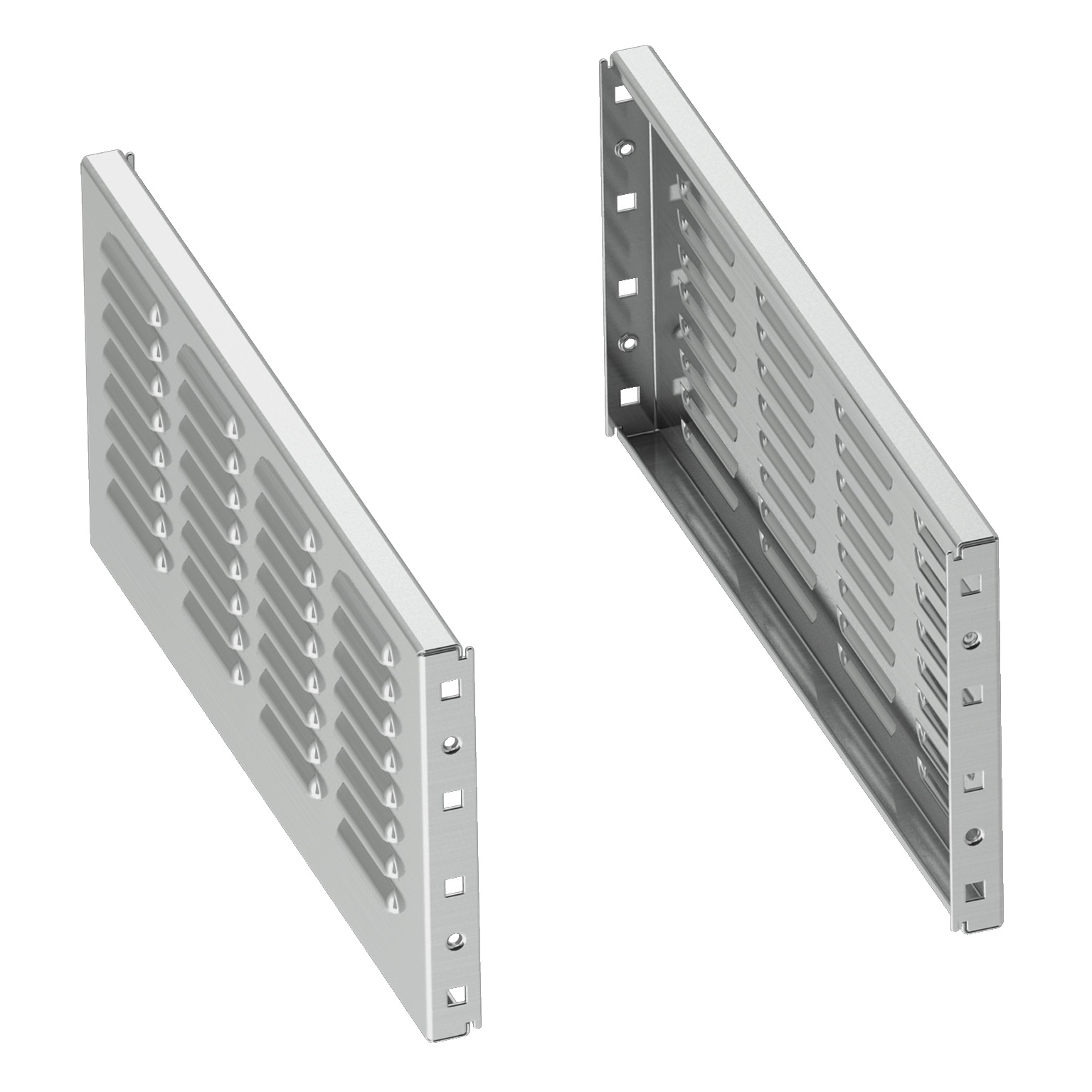 Pannello laterale dello zoccolo ventilato per applicazioni in esterni con carichi pesanti da utilizzare con gli armadi PanelSet SFHD Il pannello laterale ventilato dello zoccolo deve essere utilizzato in applicazioni multiuso L'altezza è di 200 mm La profondità nominale è 600 mm Il kit è costituito da elementi di fissaggio, 4 coperture ad angolo e 4 pannelli laterali Il prodotto è realizzato in Materiale: acciaio inossidabile Peso netto: 3,63 kg Il grado di protezione in ingresso è IP55 (zoccolo completo con griglia e filtro) La protezione meccanica nominale è IK10 Questo prodotto è classificato come Green Premium, con un uso minimo di sostanze pericolose