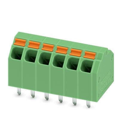Morsetto circuito stampato, corrente nominale: 17,5 A, tensione di dimensionamento (III/2): 160 V, sezione nominale: 1,5 mm², numero dei potenziali: 6, numero di file: 1, numero di poli per fila: 6, serie di prodotti: SPTA 1,5/, passo: 3,81 mm, tipo di connessione: Connessione a molla Push-in, montaggio: Saldatura a onde, direzione di collegamento conduttore/scheda: 45 °, colore: verde, Layout Pin: Pinning lineare, Lunghezza pin [P]: 3,4 mm, numero di pin di saldatura per potenziale: 2, tipo di confezione: confezionato nel cartone