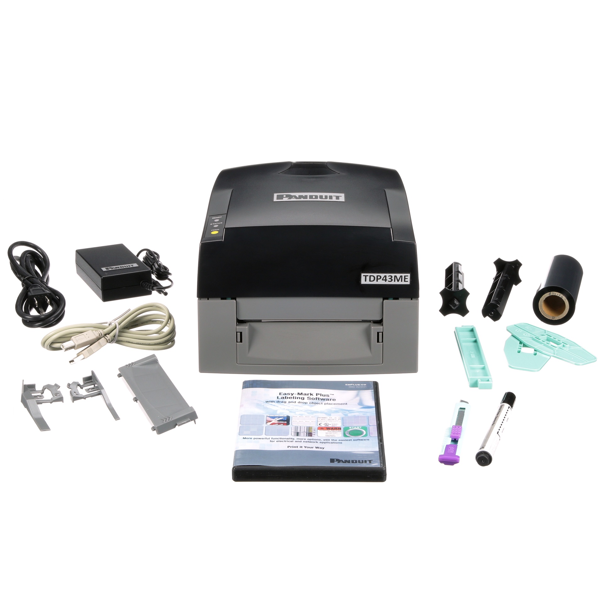 The TDP43ME Desktop Printer for international usage has 300 dpi resolution and 4" per second maximum print speed. Print a variety of labels, marker plates, and continuous tapes up to 4" wide. It includes Easy-Mark Plus Labeling Software, RMEH4BL black hybrid ribbon, a USB cable, a user manual, a quick start card, a driver disk, an AC power adapter with EuroPlug, Swiss and UK power cords, and a Japanese JIS 8303-3pin power cord. 6.8" x 8.9" (173 mm x 226 mm). 6 pounds. Color Black/Gray.