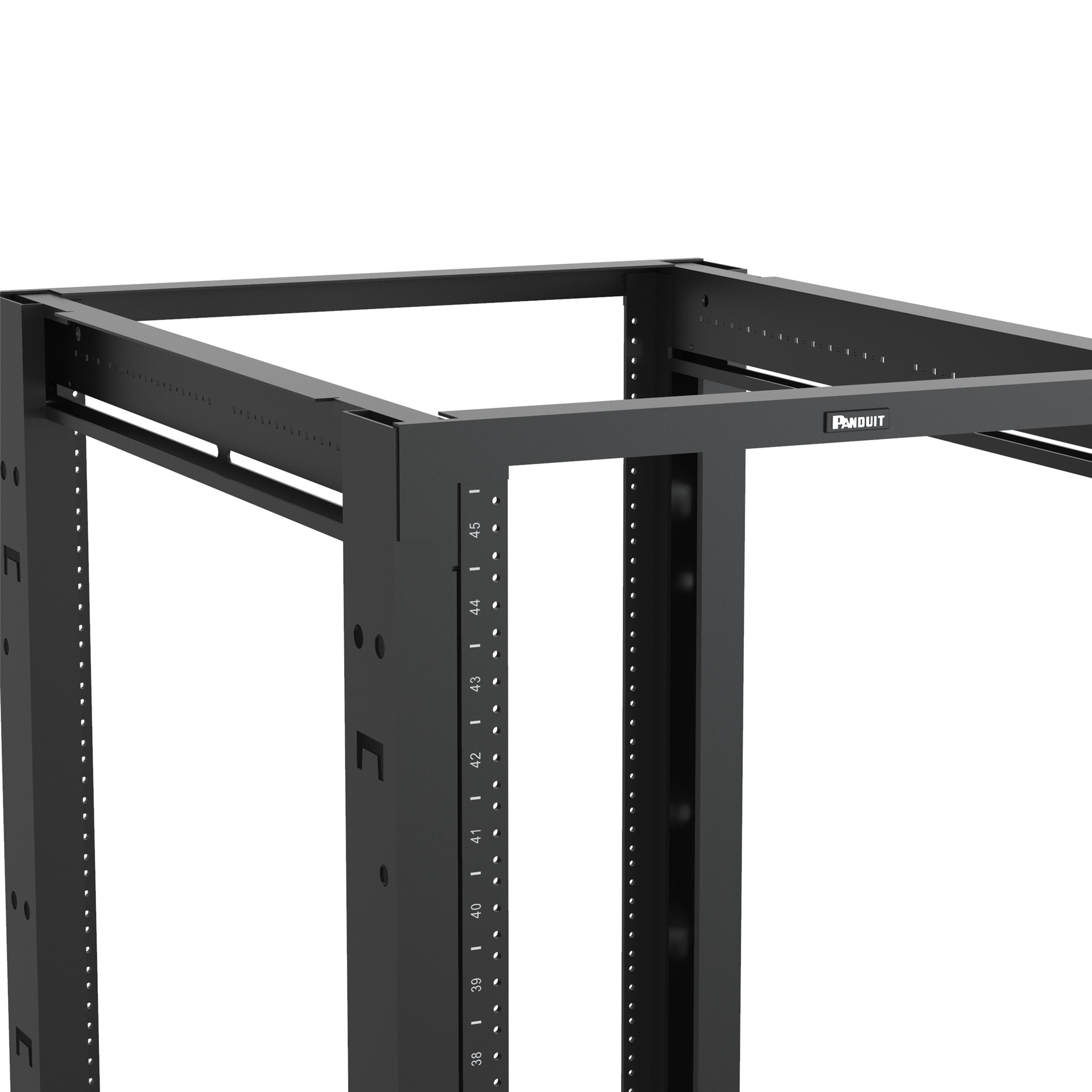 The 4 post rack combines the stability of a cabinet with the accessibility of an open rack to deliver maximum flexibility. The 45 RU rack is 23 inches wide overall (with 19 inch standard EIA mount) and 30 inches deep, with adjustable mounting rails that have #12-24 EIA universal mounting hole spacing, and printed numbering. A range of cable managers and accessories work with the rack. The rack is UL listed for 2,500 pounds and is made of welded steel. The rack is black.