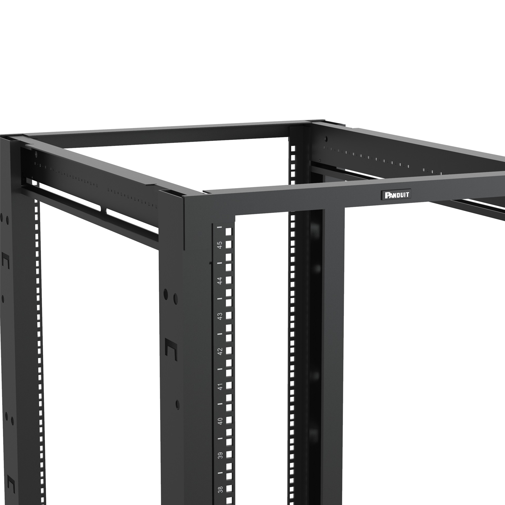 The 4 post rack combines the stability of a cabinet with the accessibility of an open rack to deliver maximum flexibility. The 45 RU rack is 23 inches wide overall (with 19 inch standard EIA mount) and 30 inches deep, with adjustable mounting rails that have cage nut EIA universal mounting hole spacing, and printed numbering. A range of cable managers and accessories work with the rack. The rack is UL listed for 2,500 pounds and is made of welded steel. The rack is black.