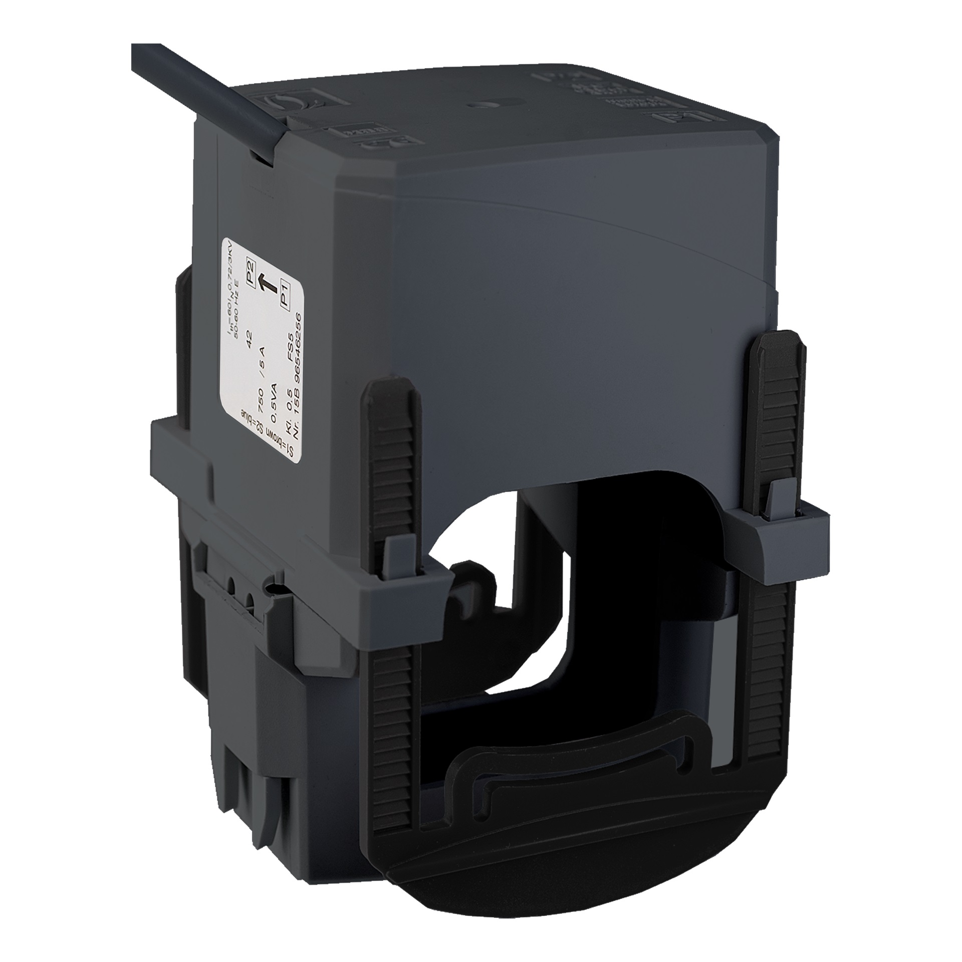 Il trasformatore di corrente, standard per cavo, ha una corrente nominale di linea di 500 A e una corrente nominale secondaria di 5 A. Questo trasformatore di corrente consente l'impiego di un cavo dal diametro esterno massimo di 42,4 mm. Carico e classe di precisione: per classe 1 potenza massima 5 VA.