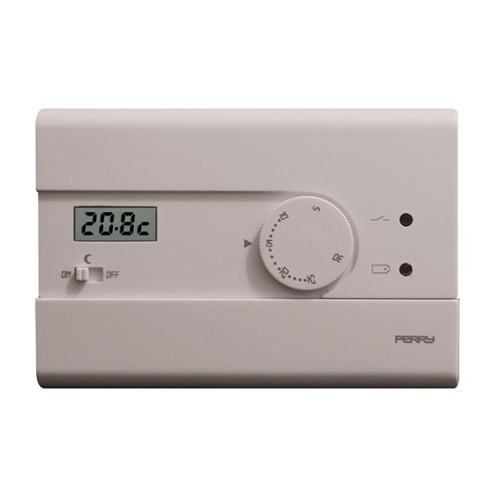 Termostato serie SLIM di colore bianco con rotella e display LCD, alimentazione a batteria e selettore ON / OFF / RIDUZIONE NOTTURNA