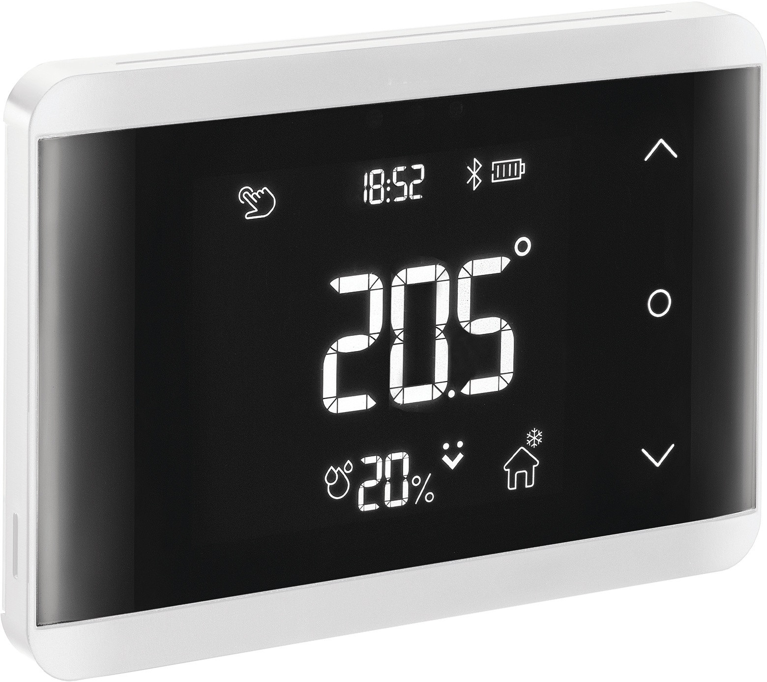 Cronotermostato Bluetooth con tasti soft touch, da incasso, colore bianco. Alimentazione a batterie 3x1,5 V tipo AA.