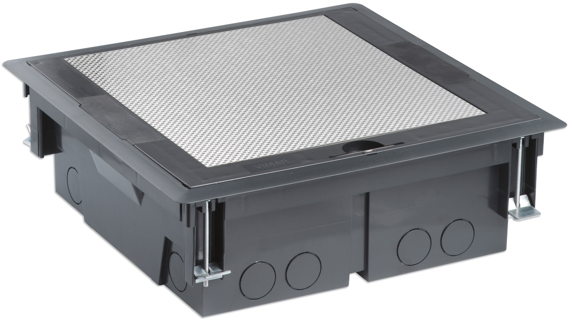 Torretta a scomparsa da pavimento da 20 moduli con coperchio inox per apparecchi Eikon, Arké e Plana per installazione su pavimento flottante. Fornita con 4 supporti da 5 moduli. Installazione su massetto con apposita scatola V54920