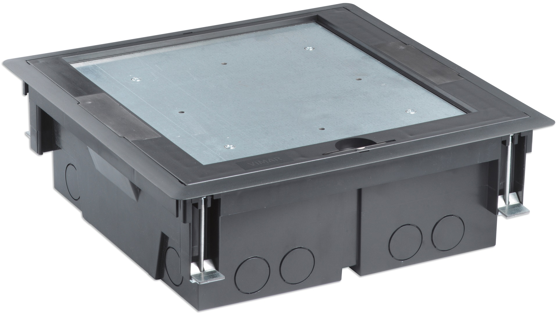 Torretta a scomparsa da pavimento da 20 moduli con coperchio cavo per apparecchi Eikon, Arké e Plana per installazione su pavimento flottante. Fornita con 4 supporti da 5 moduli. Installazione su massetto con apposita scatola V54920