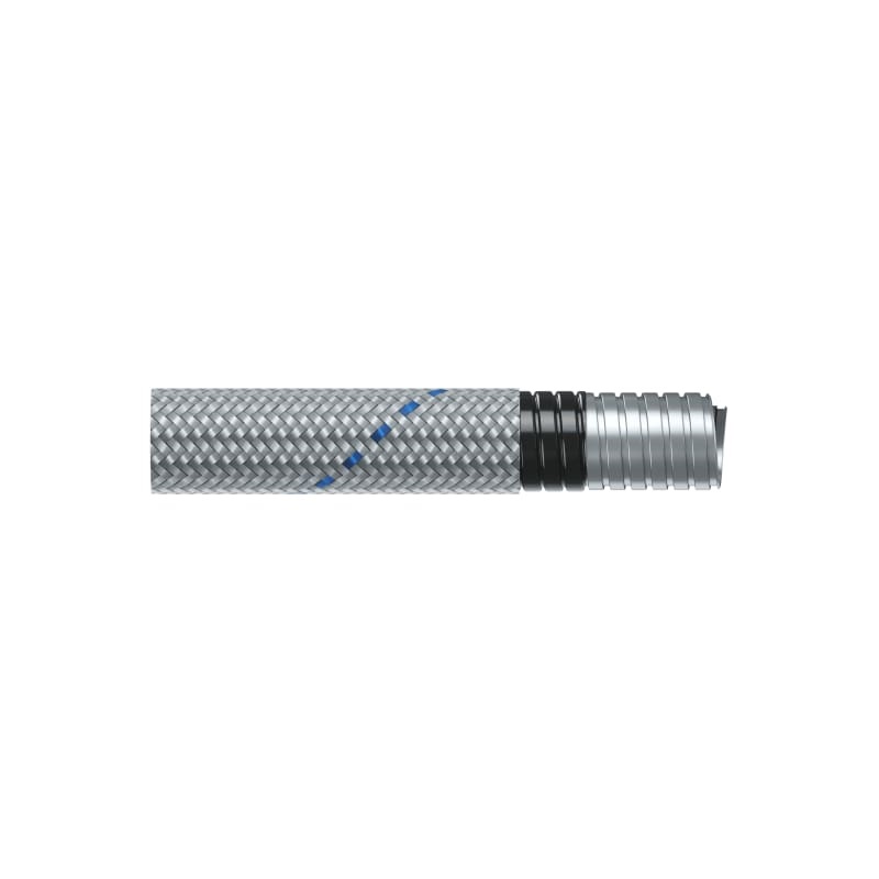 Guaina metallica trecciata che garantisce un'elevata protezione contro roditori, scorie taglienti, trucioli roventi e in condizioni gravose come l'installazione su sistemi frenanti, apparecchiature di saldatura e macchine di pressofusione. Soddisfa una vasta area di applicazioni, che comprendono l'impiantistica industriale, l'installazione a bordo macchina e le costruzioni navali. Guaina flessibile in acciaio zincato a semplice aggraffatura con rivestimento esterno in resina di polivinile aspirato e successivamente rivestita con treccia di fili in acciaio zincato. Buona resistenza meccanica (compressione/impatto). Buona resistenza alla temperatura. Ottima resistenza alla abrasione e al taglio. Compatibile con l'intera gamma dei raccordi CM, con i quali si ottiene un grado di protezione IP67.
