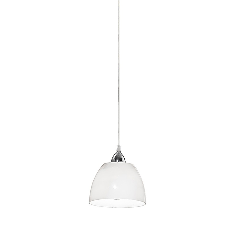 Lampada a sospensione in vetro soffiato bianco latte lucido a forma di cupola e struttura in metallo cromato. Disponibile in due dimensioni, la versione piccola viene proposta anche in cadute multiple sia con rosone (a tre e sei feritoie) che con kit decentramento (a tre e cinque elementi). Attacco E27 che consente di montare lampadina LED.