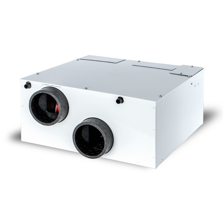 Involucro in lamiera d’acciaio verniciata di colore bianco, comprensivo degli attacchi per il fissaggio delle staffe, in lamiera d’acciaio zincata, fornite di serie e necessarie all’installazione sospesa dell’apparecchio; particolari interni in polipropilene espanso (PPE). • Bocche di connessione alle tubazioni di aspirazione e mandata compatibili con diametri nominali pari a 100 mm e 125 mm. • 2 motori EC brushless, ciascuno abbinato ad una girante centrifuga a pale avanti; 3 velocità indipendentemente regolabili, gestite da un’elettronica di controllo in grado altresì di monitorare eventuali malfunzionamenti che vengono registrati nel microcontrollore presente a bordo macchina. • Scambiatore di calore ad elevata efficienza del tipo a flussi in controcorrente realizzato in materiale plastico (PS). • By-pass meccanico, 100% filtrato, ad azionamento automatico. • Sensore di Umidità Relativa, per la gestione automatica della velocità di funzionamento. • Sistema ad attivazione automatica per prevenire la formazione di ghiaccio sullo scambiatore di calore. • Coppia di filtri ISO COARSE 45% (G3), posti in corrispondenza dei condotti di estrazione e mandata; in opzione sono disponibili filtri ISO COARSE 65% (G4) per il canale di estrazione, ePM10 50% (M5), ePM1 55% (F7) ed ePM1 80% (F9) per quello di mandata. • Gruppo comandi remoto a connessione filare, completo di display LCD, per: • il settaggio iniziale del prodotto. • l’avvio / l’arresto del prodotto. • la selezione manuale della velocità di funzionamento, tra quelle precedentemente impostate. • l’impostazione della funzione “BOOST ROOM LIGHT”: il prodotto passa automaticamente a Vmax, se collegato all’accensione della luce nel bagno. • la visualizzazione della velocità di funzionamento selezionata. • la visualizzazione dell’attivazione automatica del by-pass. • la visualizzazione dell’attivazione della procedura di defrosting. • la visualizzazione dell’attivazione automatica del pre-heater (opzionale) eventualmente installato. • l’impostazione del passaggio del funzionamento a Vmax, qualora abbinato ad un sensore di presenza (PIR). • la visualizzazione della condizione di filtri saturi • la visualizzazione di eventuali codici di errore. • Vaschetta di recupero condensa in resina plastica con sensore anti-tracimazione.